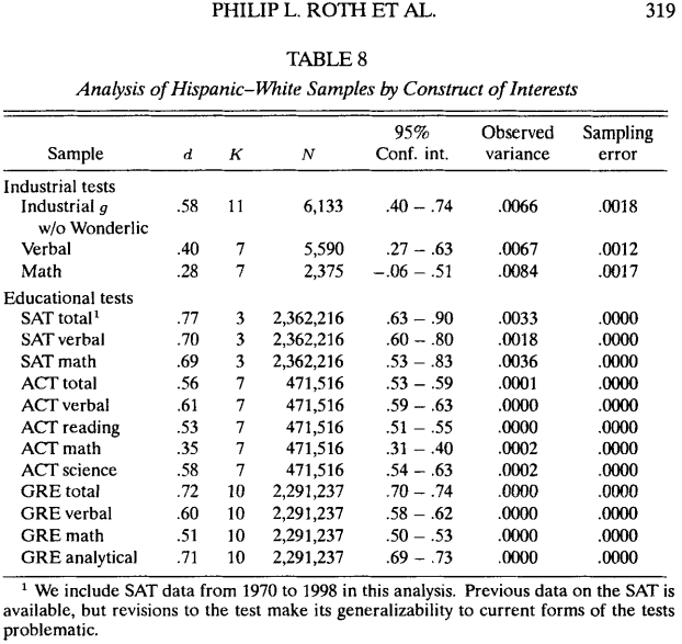 In other words, this meta-analysis considered overall 39 studies with a combined sample size (all ethnicities) of 5,696,519 (only age 14 and above). The overall white-Hispanic gap was 0.72 standard deviations or (expressed on an IQ scale) 10.8 IQ points. This is a larger gap than Linda Gottfredson's 1988 estimate of a 7.5 IQ point gap.